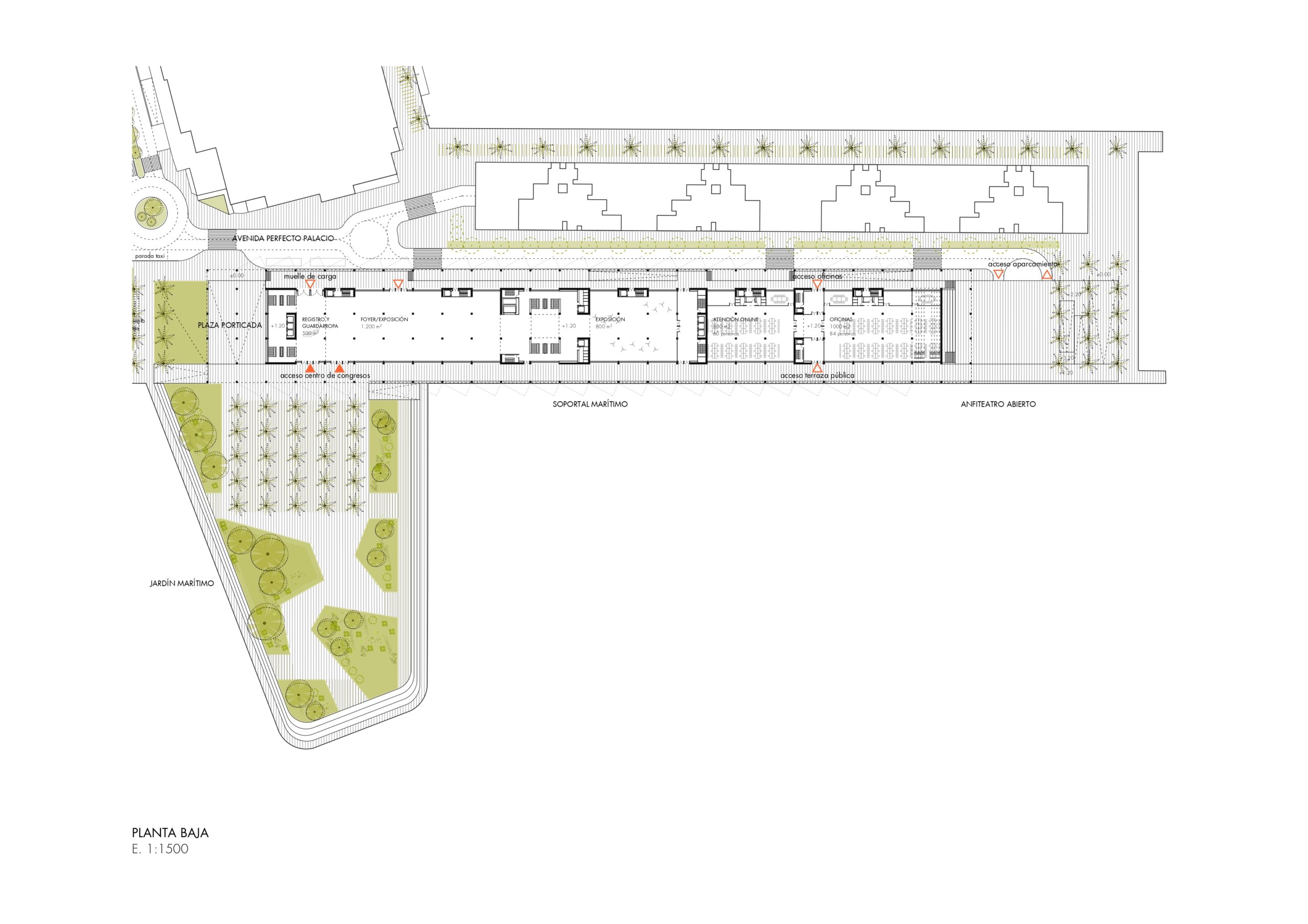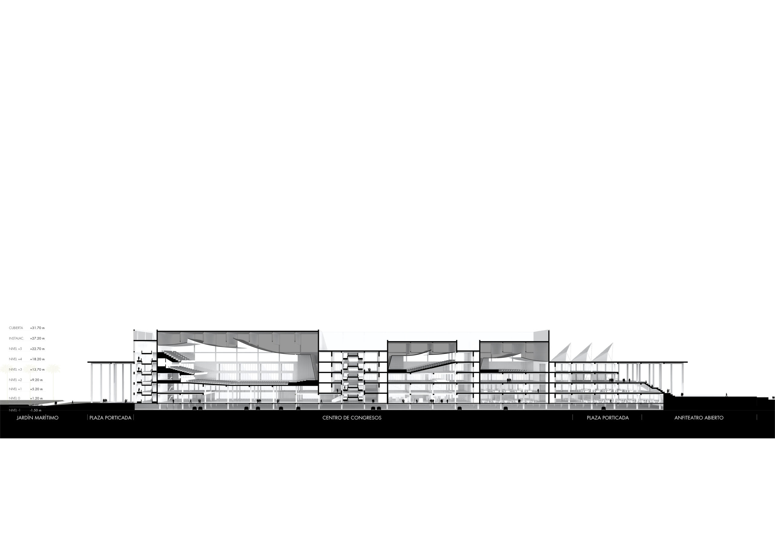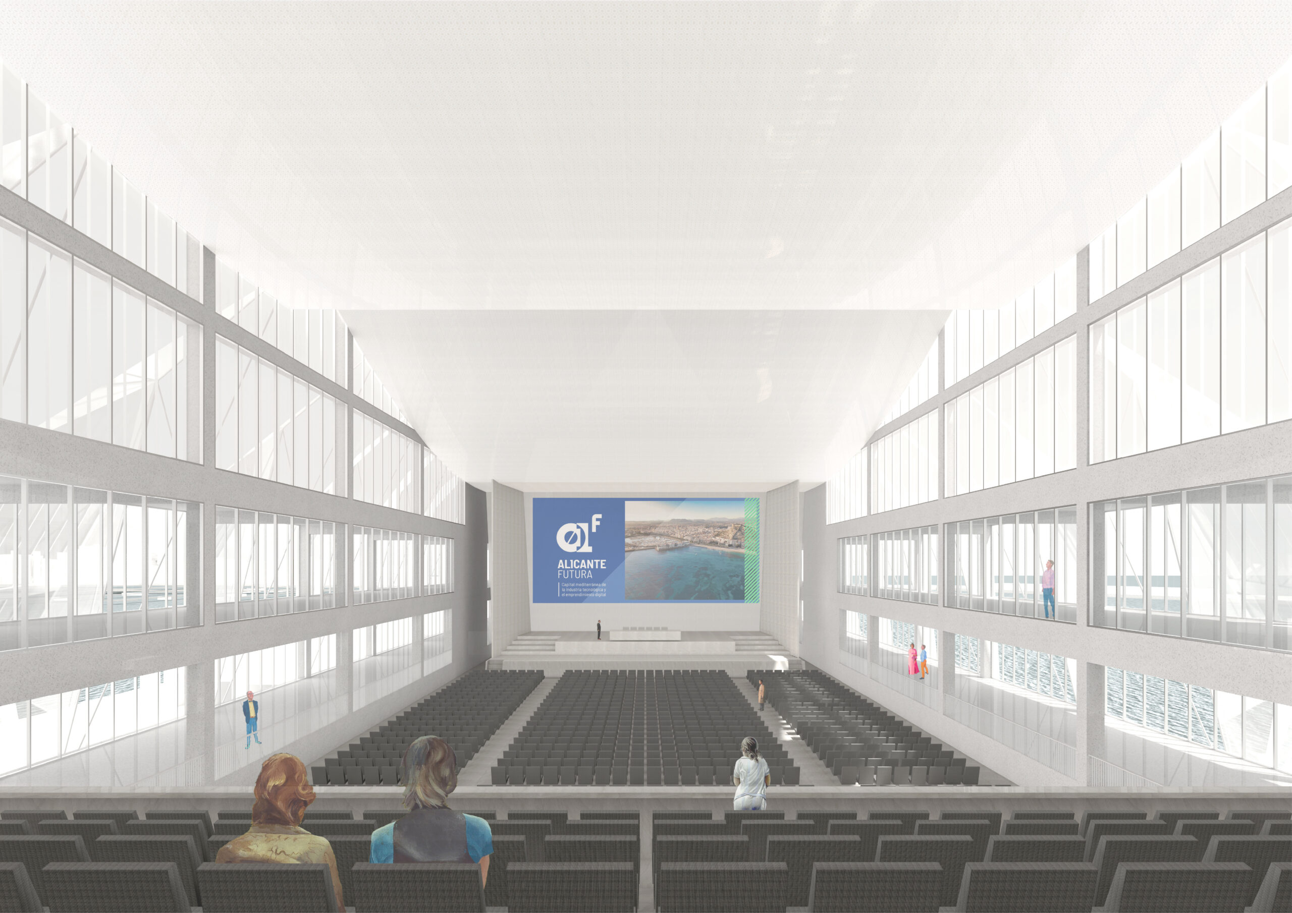 La presencia del nuevo edificio, que contiene auditorios con capacidades de 300 a 2,000 plazas bañados de luz natural, está subrayada por el ritmo ordenado de su estructura de hormigón blanco y la ligereza de la arquitectura textil que proporciona un sistema de sombra en sus dos principales orientaciones más castigadas por el sol de levante y de poniente. La propuesta no solo busca ser un poderoso recurso económico, sino también un equipamiento social que da la oportunidad a los ciudadanos de acercarse al mar desde un nuevo Jardín Marítimo.