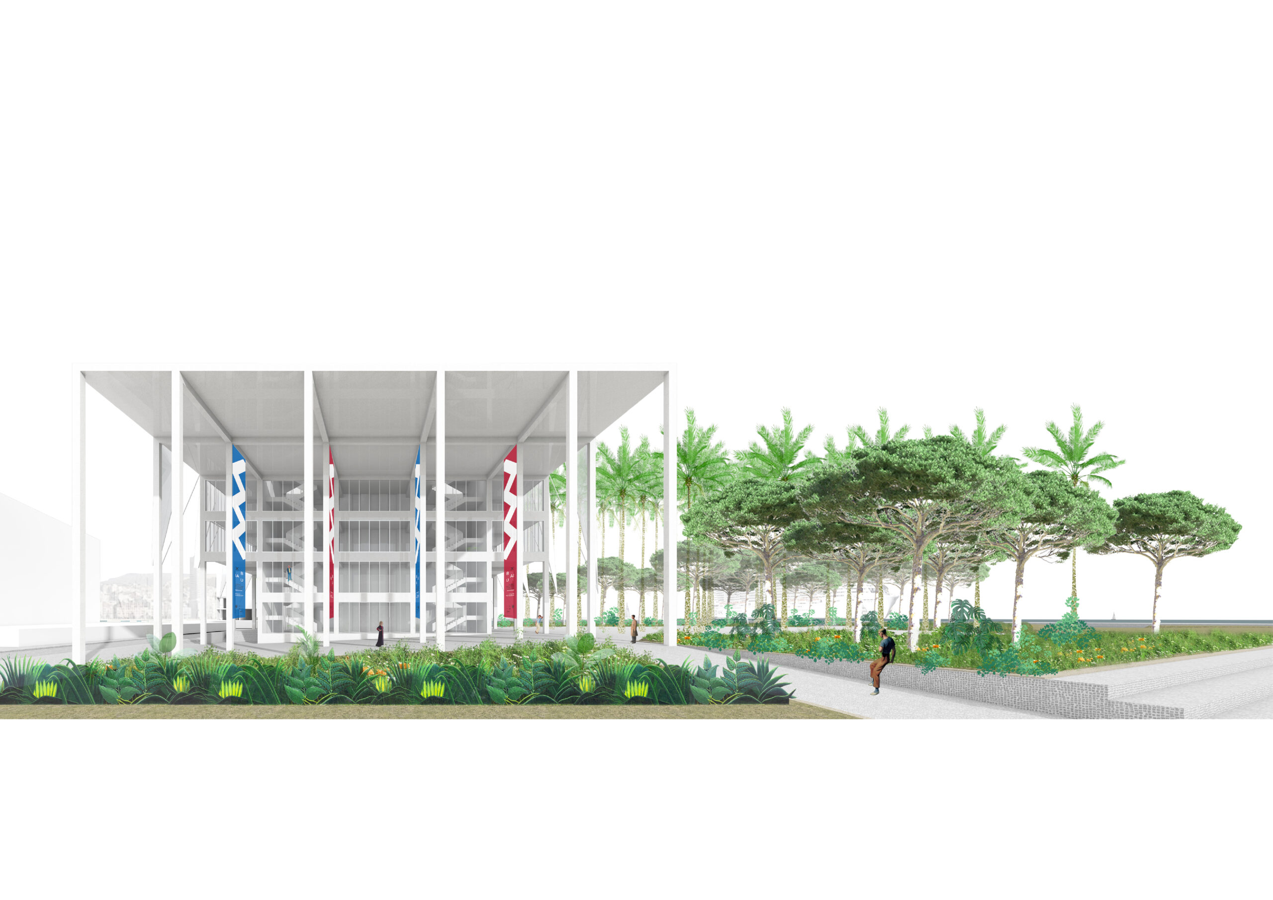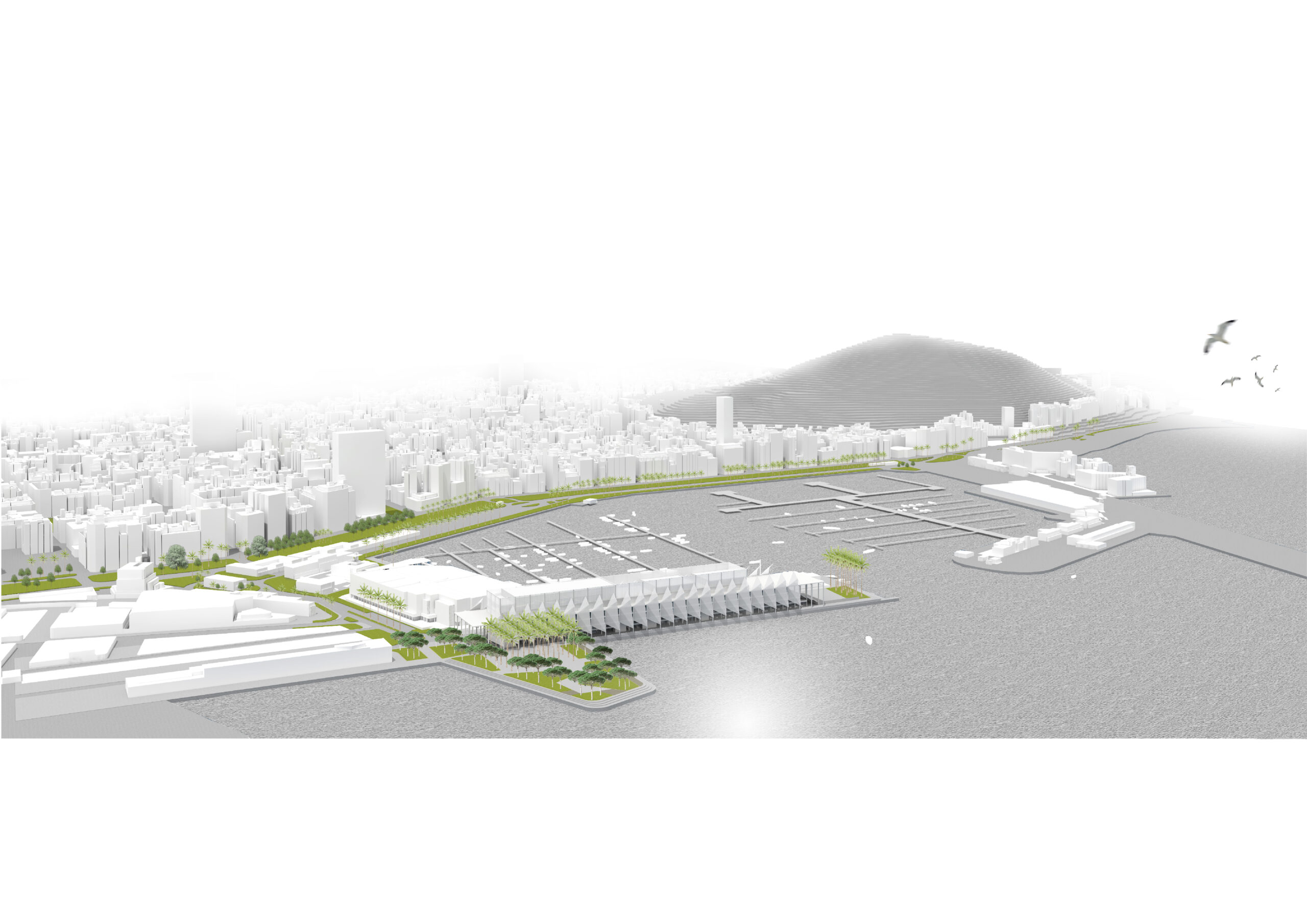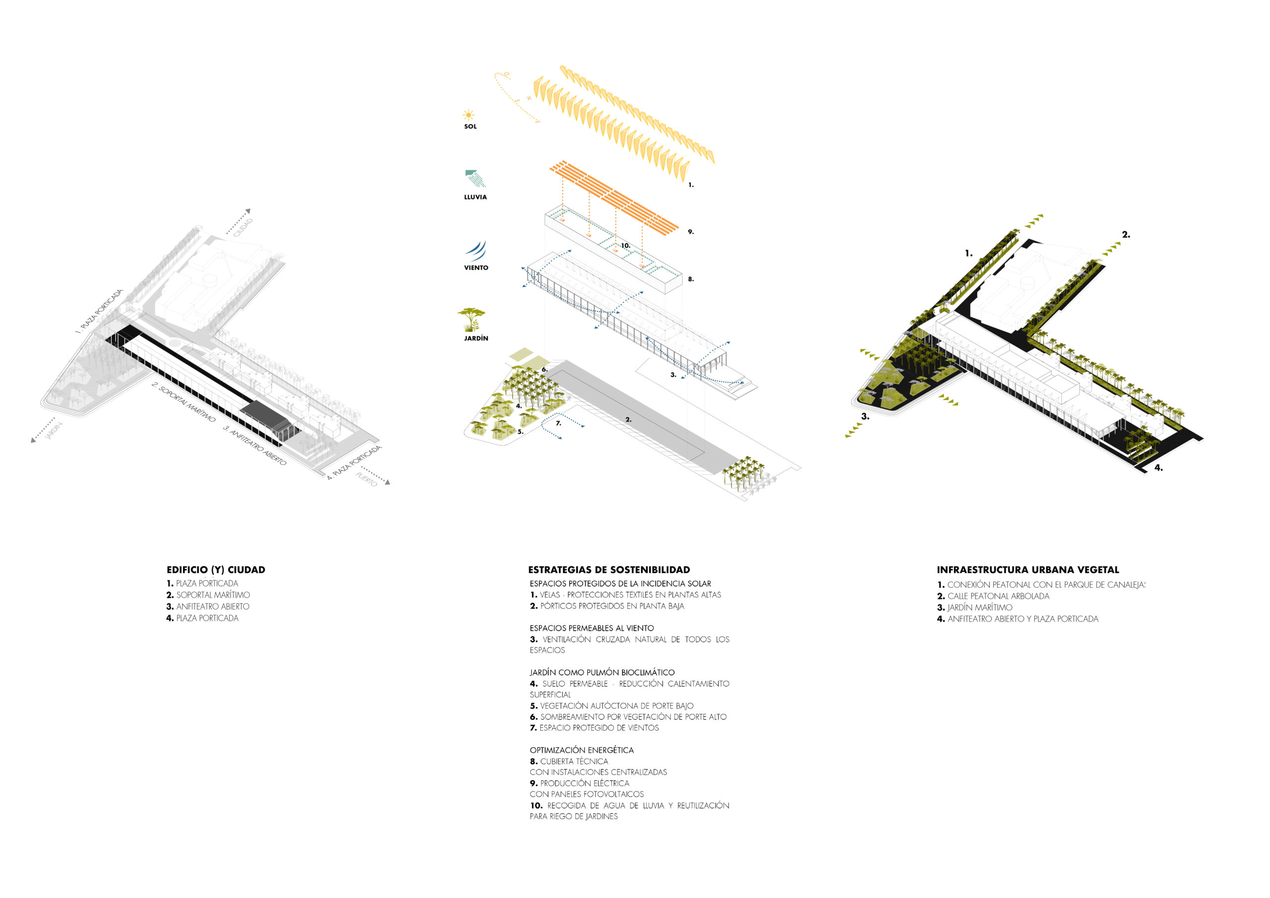 La presencia del nuevo edificio, que contiene auditorios con capacidades de 300 a 2,000 plazas bañados de luz natural, está subrayada por el ritmo ordenado de su estructura de hormigón blanco y la ligereza de la arquitectura textil que proporciona un sistema de sombra en sus dos principales orientaciones más castigadas por el sol de levante y de poniente. La propuesta no solo busca ser un poderoso recurso económico, sino también un equipamiento social que da la oportunidad a los ciudadanos de acercarse al mar desde un nuevo Jardín Marítimo.